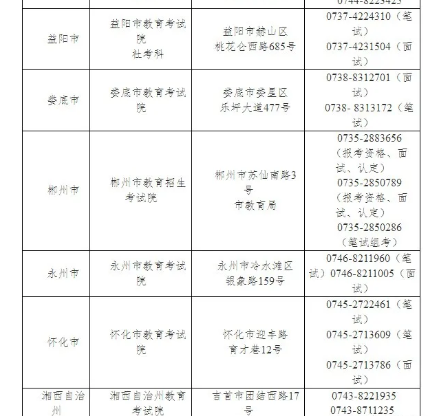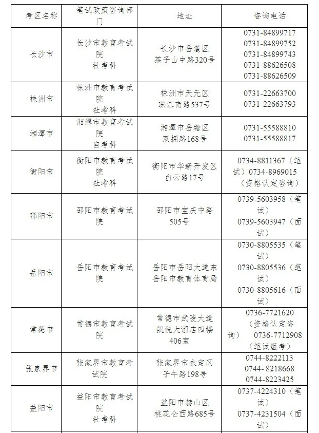 (七)湖南省中小學(xué)教師資格考試(筆試)各考區(qū)(市州教育考試院)聯(lián)系地址和電話如下表: